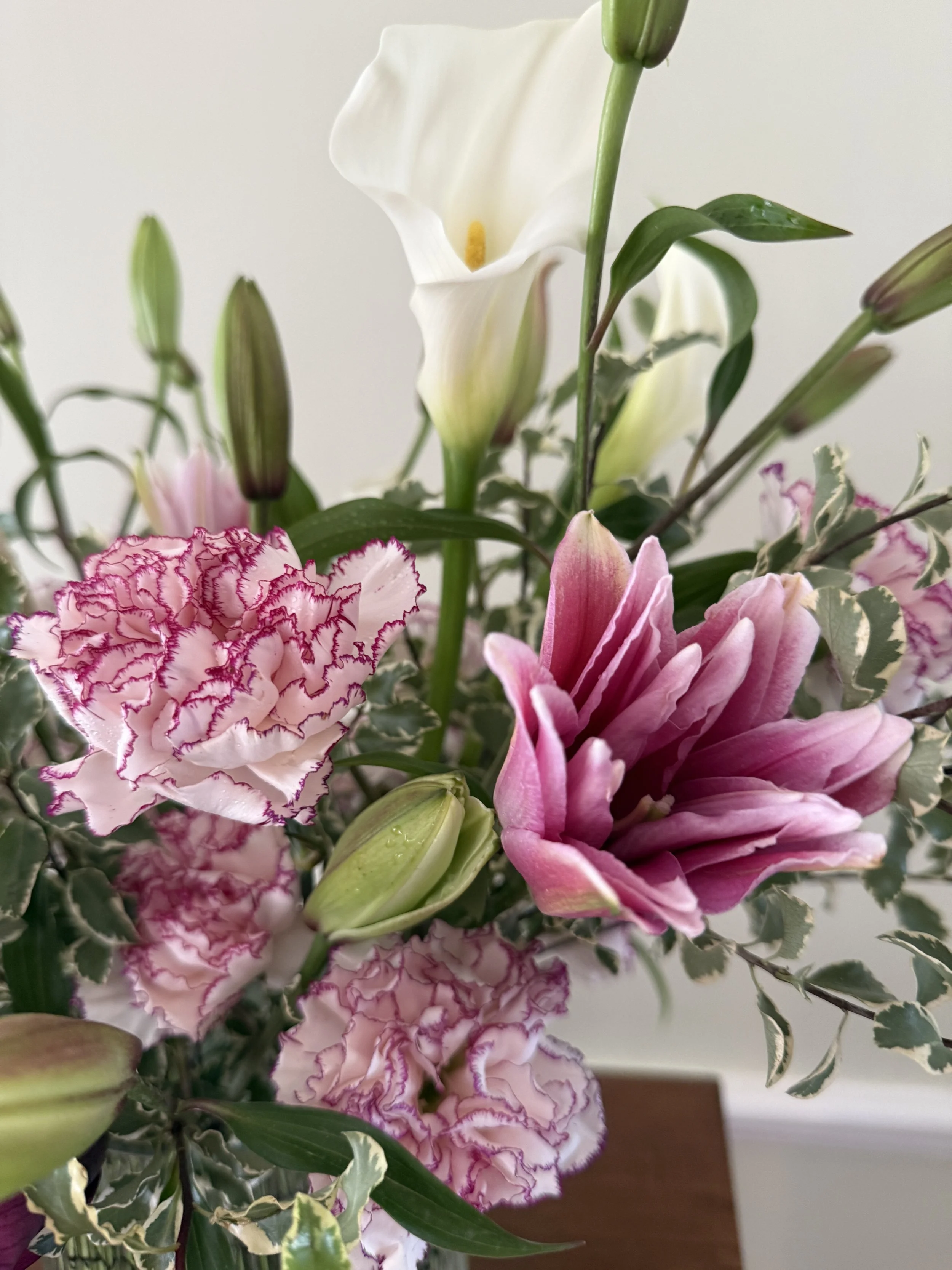 Arrangements will each have double lilies, calla lilies, variegated carnations, and silver queen pittosporum, in clear glass ribbed container.